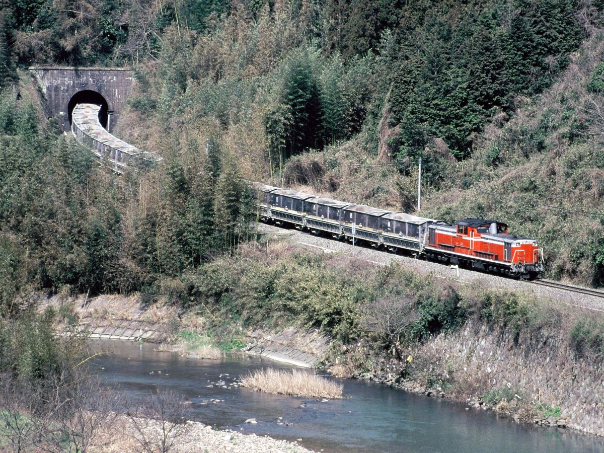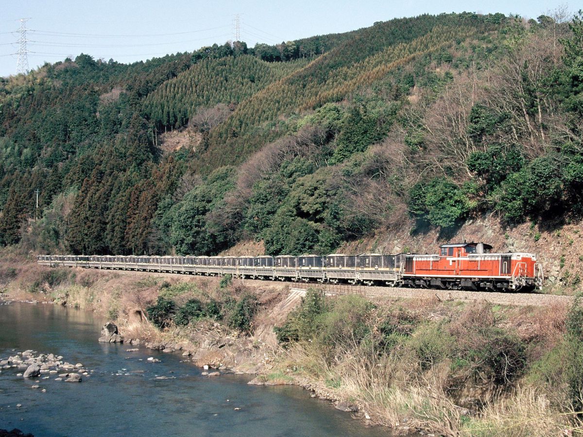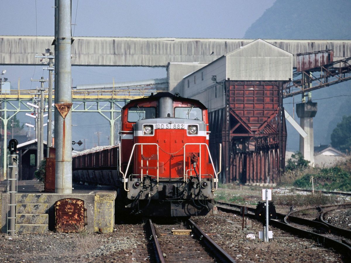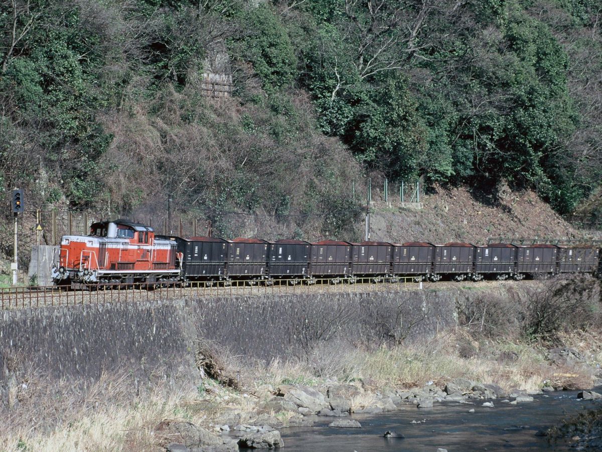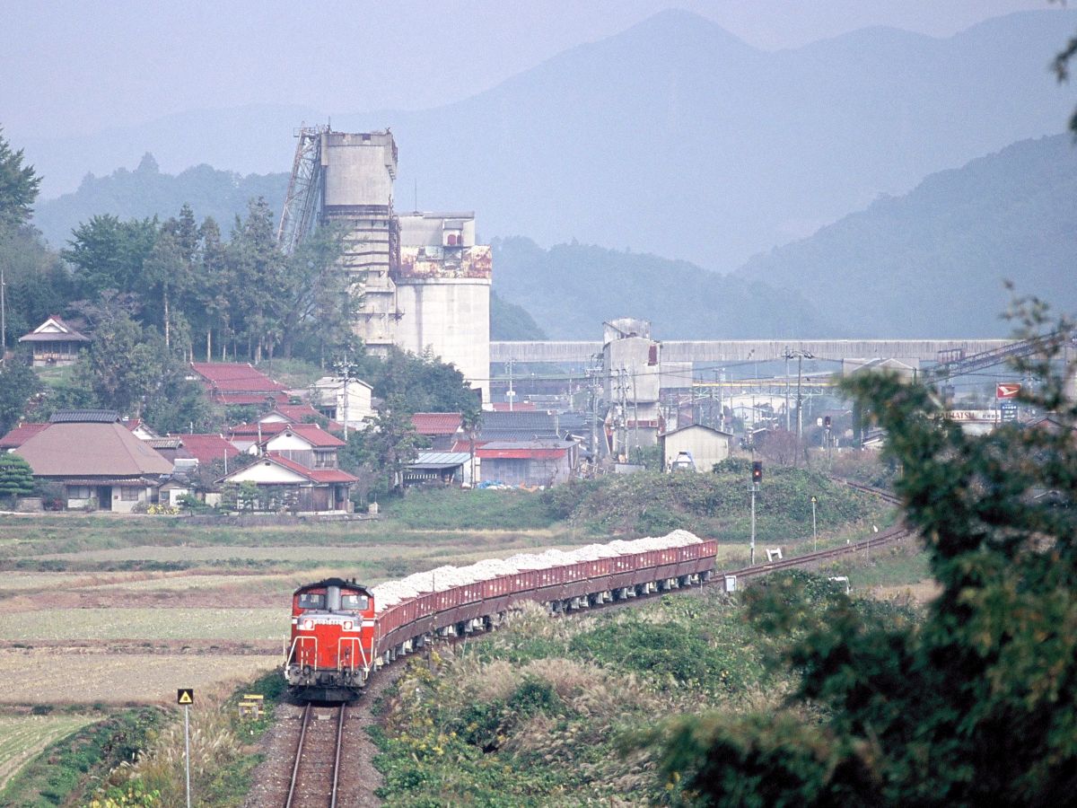 しかし、言わずもがな日本経済は衰退へ。需要減によるセメント不況から必要原料も減り続け、とうとう専用道路のみで賄えるレベルに。ついに鉄道貨物は1998年3末にて全廃となります。昔は日本各地にあった鉱石列車はいまや岩手開発鉄道、秩父鉄道、西濃鉄道=JR=名古屋臨海鉄道と三岐鉄道=JRぐらいになったんだよねえ。。。(デンカの原石線も細々とあるか・・・)↓