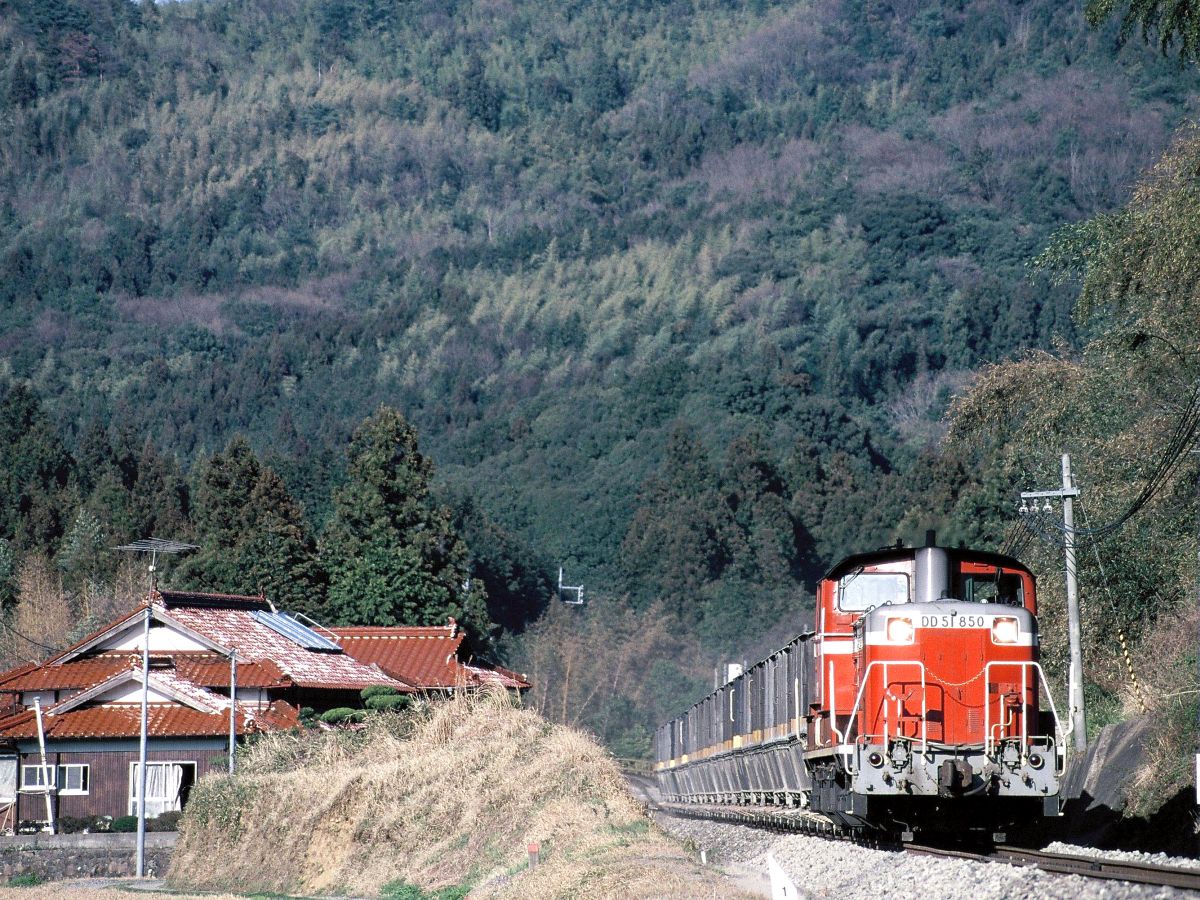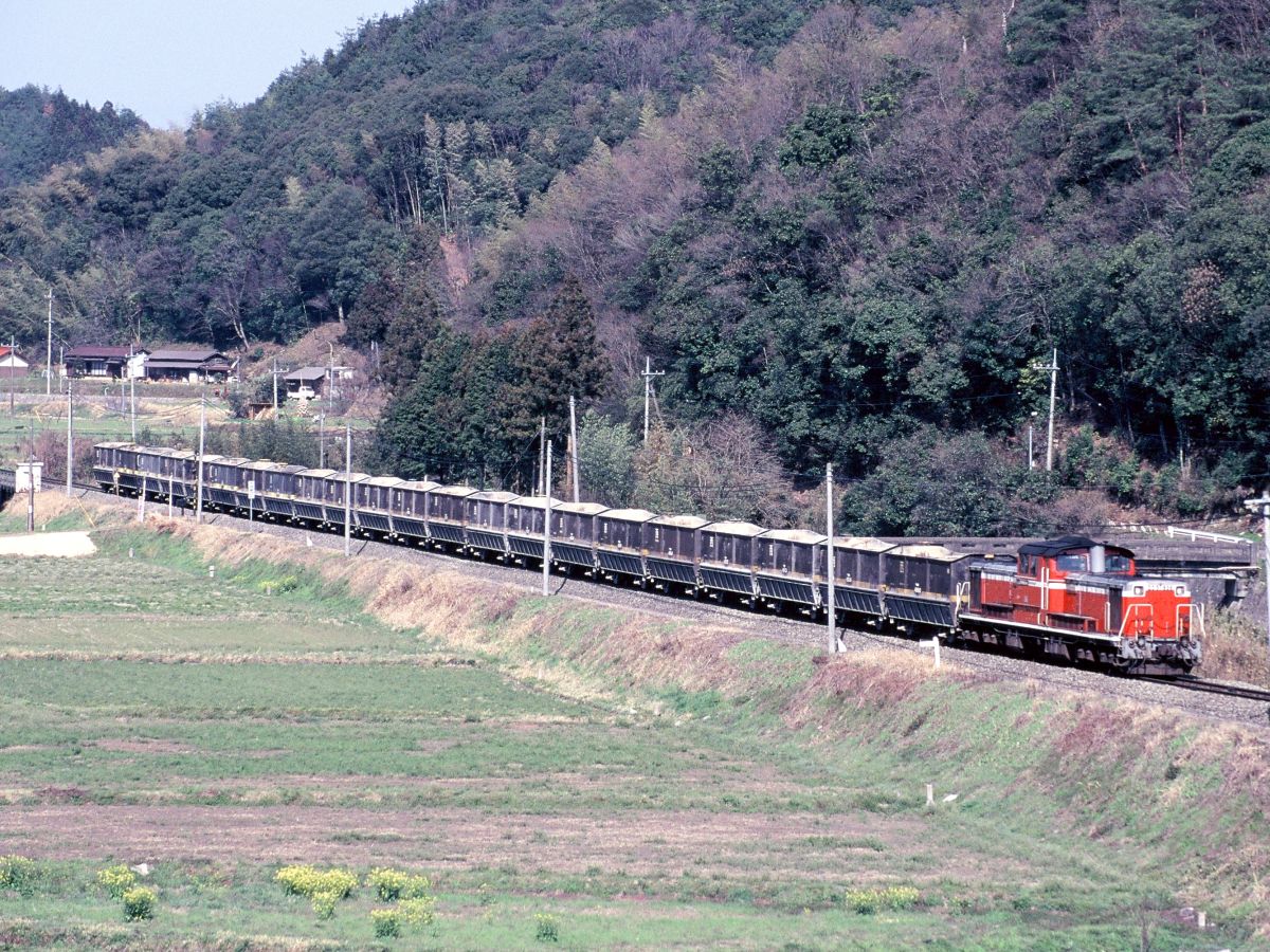 で、宇部興産貨物廃止後すぐの1998年6月、新たな貨物列車がスタートします。これが当時撮り鉄憧れの通称「岡見貨物」なんですよね。宇部興産伊佐セメント工場と中国電力三隅発電所をつなぐ列車で、伊佐工場から専用線を経て美祢、厚狭、新山口を経て山口線を通り、山陰線岡見までを結んでいました。↓