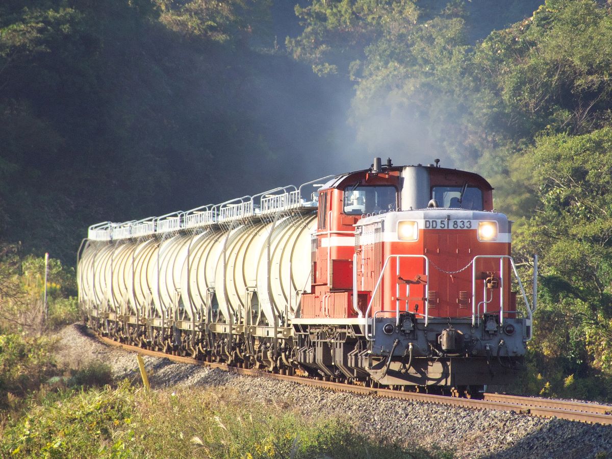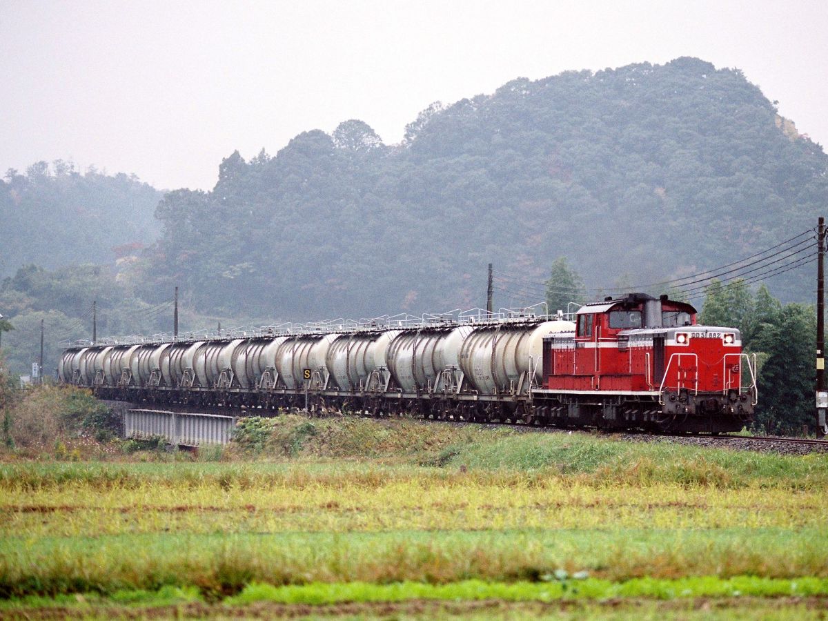 これ、伊佐からは炭カルを、発電所からはフライアッシュを同じ貨車で相互に運ぶというもの。返空なしで往復満載できるという、効率のいい輸送形態で「環境にやさしい」と注目を浴びていました。同じようなことはいまでも東藤原⇔碧南でやってますね。↓