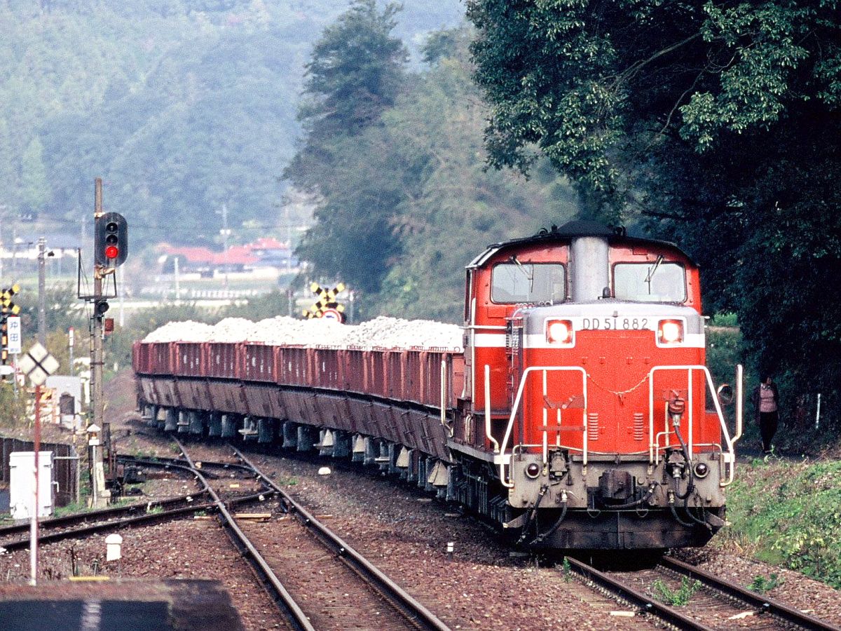 美祢線を南下、DD51は厚狭までとなり、編成を分割してDE10にバトンタッチして宇部線に入ります。通常宇部線内は2回に分けて運行されてたんですが、晩年は荷が少なくなり、機関車付け替えだけで宇部線に入って行ってたと思います。↓