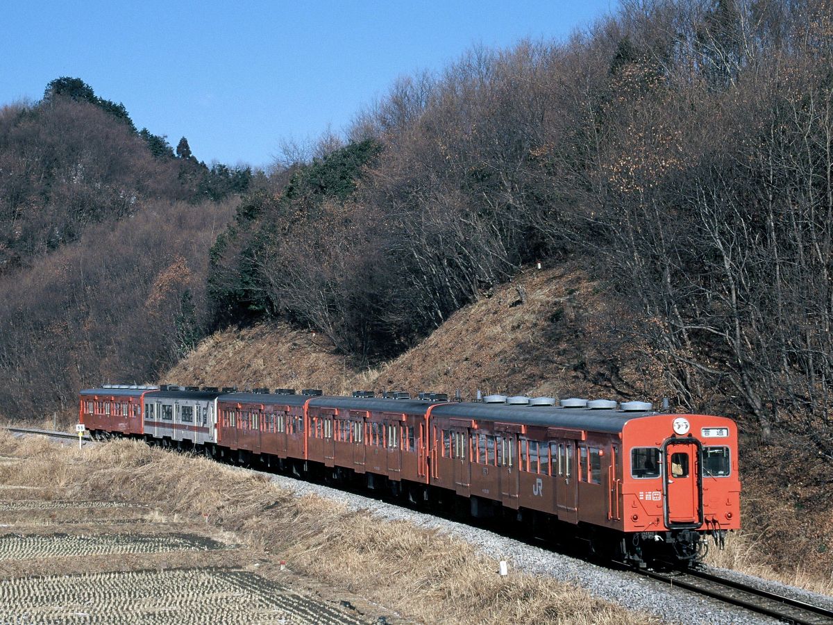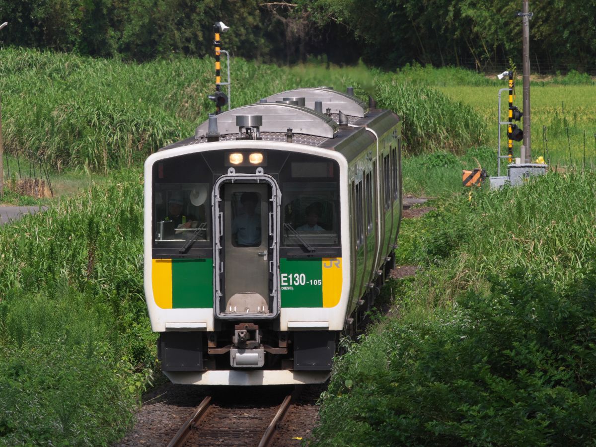 2012年12月からE130に統一、タブレットは一足先の3月で終了にて、現在の姿になるわけですね。日中の単行運転ではワンマン化され、やっと国鉄縛りから解放されたって感じとなりました。以前と比べてかなり垢抜けしたんですが、旅客減は止まらず今回の末端部廃止論へとなるわけで・・・サービス向上でもそもそも住んでる人が減ったら利用者は増えないからなあ・・・全国のローカル線問題そのものです。↓