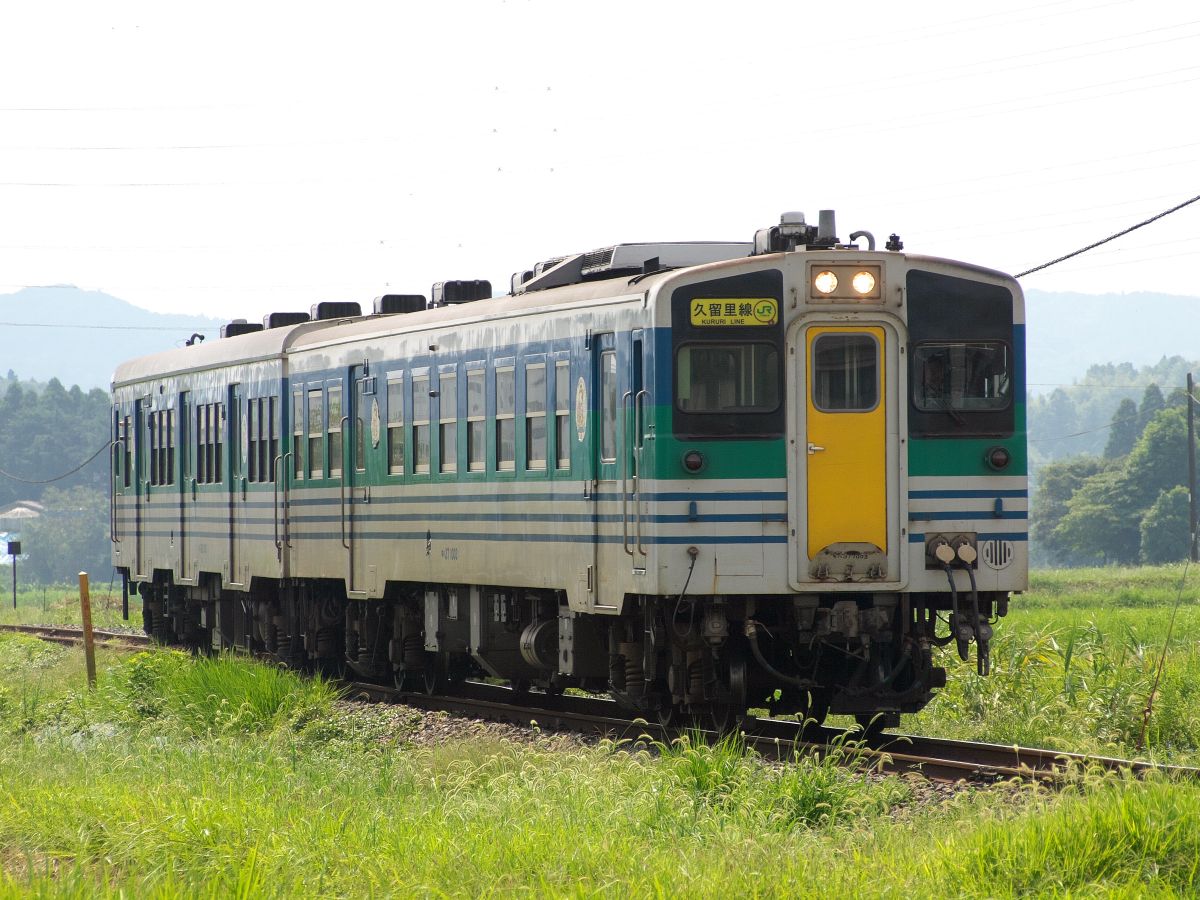 で、先述の八高線部分電化にて八高線では車両を大がかりに更新。電化部分はE231を投入、非電化部分はキハ110にてキハ35/38を完全淘汰。そのうちキハ38まだ新しいとあって全7両が久留里線へ回ってきます。久留里線転属時に新しい久留里線色にリメイクされ、供用となるキハ37も冷房化&新塗装となってこのシマシマカラーに統一されます。写真、キハ37+38ですが、2ドアが37、3ドアが38となります。正面は前照灯の位置が違うので見分けがつきやすいですね。↓