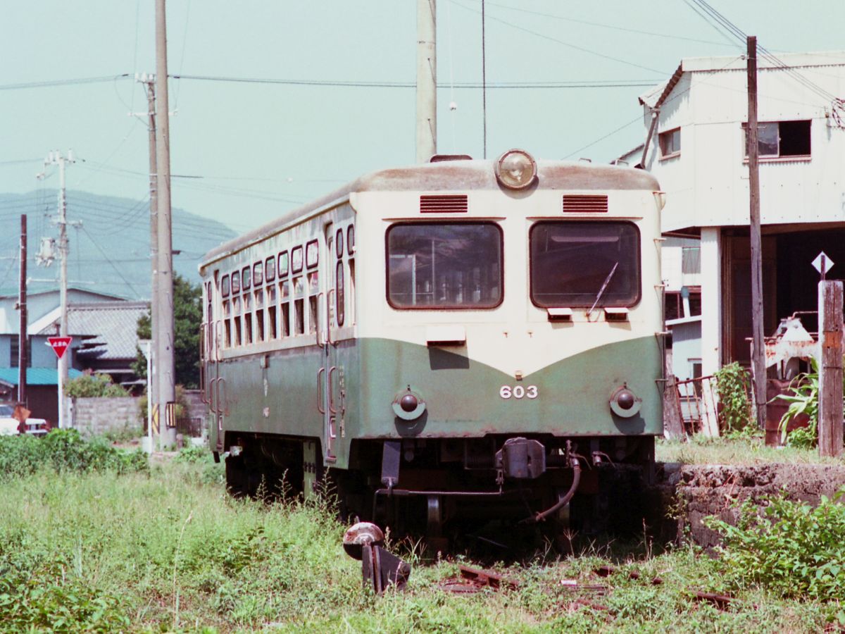 そしてこいつ、一度も営業に就けなかったキハ1000形。1984年に廃止となった岡山臨海鉄道から譲り受けたもので2両体制の600の予備車として使いたかったんですが、車齢が600より古く、足回りもガタガタだったようで、全線試運転のチェック後「こいつ、使えんやん!」となり放置されることになります。↓